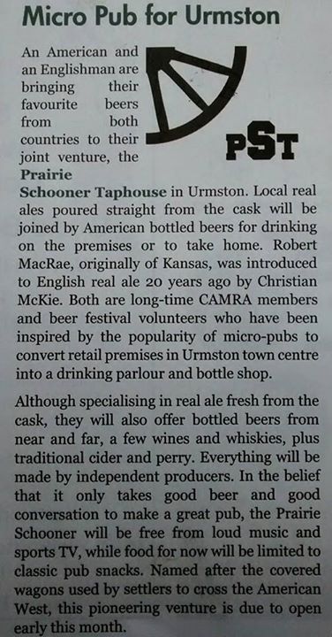 Tony Naylor also mentioned us in his 2015 piece for Olive Magazine titled Why We Love Craft Beer, in which he encouraged readers to ‘treasure the distinctive atmosphere of food-free bars…try Urmston’s Prairie Schooner.’